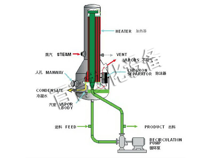 需濃縮的料液由泵送入加熱管頂部,沿著加熱管內(nèi)壁形成液膜向下流動。在這個過程中,由于管外的加熱,管內(nèi)液膜開始沸騰并部分蒸發(fā)。在列管下部分及其下游的分離器中,剩余的液體和蒸汽得以分離。