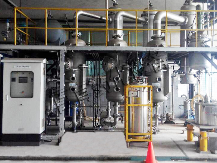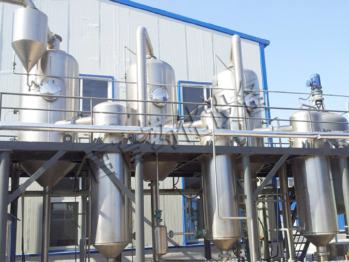 三效蒸發(fā)器主要由相互串聯(lián)的三組蒸發(fā)器、冷凝器、鹽分離器和輔助設(shè)備等組成。三組蒸發(fā)器以串聯(lián)的形式運行,組成三效蒸發(fā)器。整套蒸發(fā)系統(tǒng)采用連續(xù)進料、連續(xù)出料的生產(chǎn)方式。